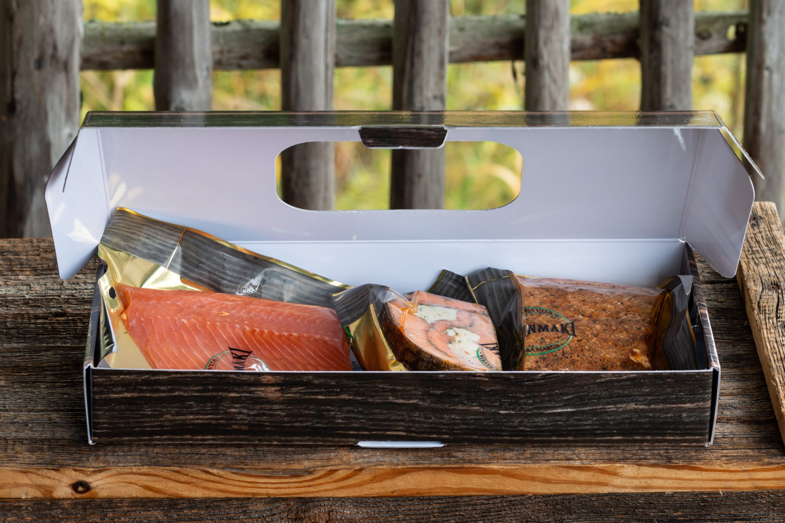 1. Kalaherkkulaatikko sisältää kaikki Martinmäen suosituimmat kalaherkut – kylmäsavulohen, pippurilohen ja aurajuustolohen. Laatikko on saatavana tyylitellyssä kartonkilaatikossa.